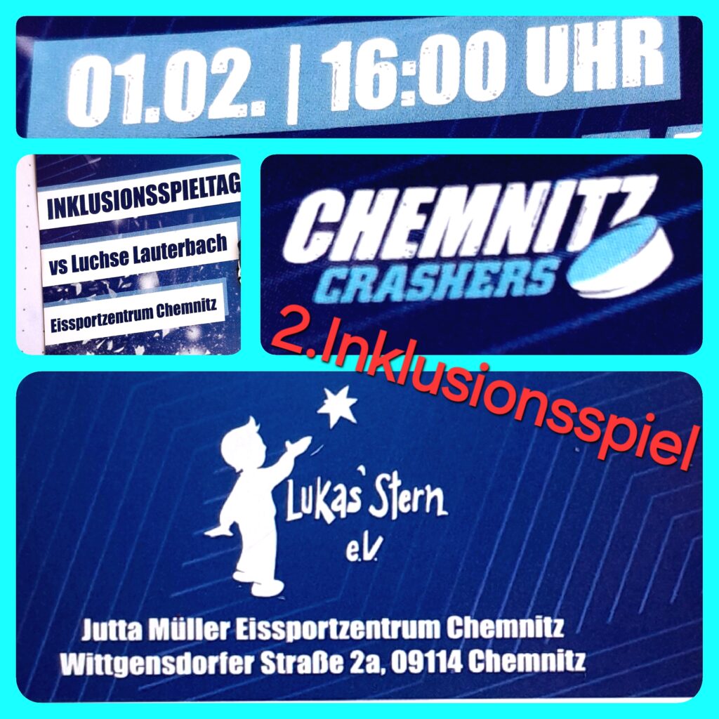 Am Sonntag, den 01.02.2026 findet wieder, unter der Schirmherrschaft von Lukas Stern e.V., einem Verein, der schwer erkrankten Menschen, sowie Menschen mit Handycap Herzenswünsche erfüllt, dass zweite inklusive Eishockeyspiel statt. Es spielen die „Chemnitzer Crashers“ gegen die „Luchse Lauterbach“ im Jutta Müller Eissportzentrum Chemnitz.
