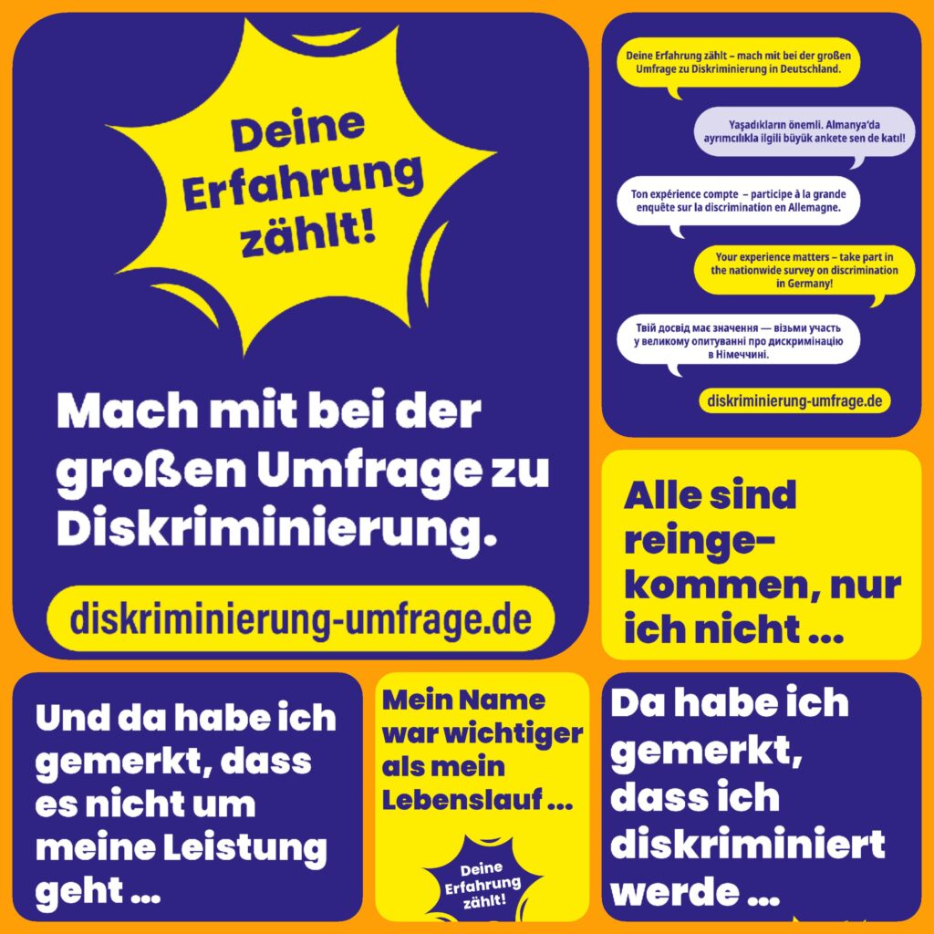 Vom 12. November 2025 bis 28 Februar 2026 führt die Antidiskriminierungsstelle des Bundes die bislang größte Umfrage zu Diskriminierung in Deutschland durch. Ziel ist es, im Jahr 2027 ein detailliertes Lagebild zu veröffentlichen, das aktuelle Daten enthält, wie Menschen hierzulande Diskriminierung erleben und wie sie damit umgehen. Auf dieser Basis werden Forderungen ausgearbeitet, wie Diskriminierungsschutz verbessert werden kann.